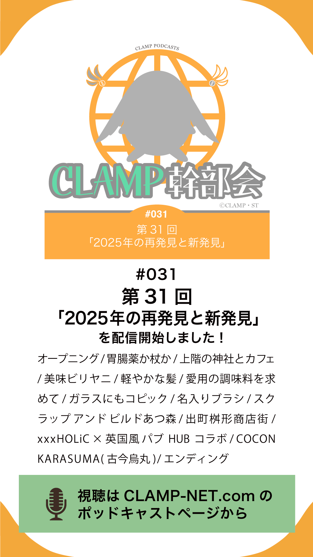 ポッドキャスト聴取方法、お便り方法等はこちら:https://clamp-net.com/podcasts